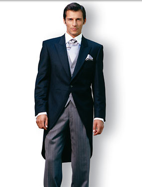 { morning coat } This is a formal option more suited to ceremonies set in the morning or early afternoon. You see morning coats usually in grey or black, but as with most things the times are a-changin'. You'll notice that a true morning coat has a broad tail in the back ( a major difference from the traditional suit). They are most commonly worn with a bow tie or an ascot.